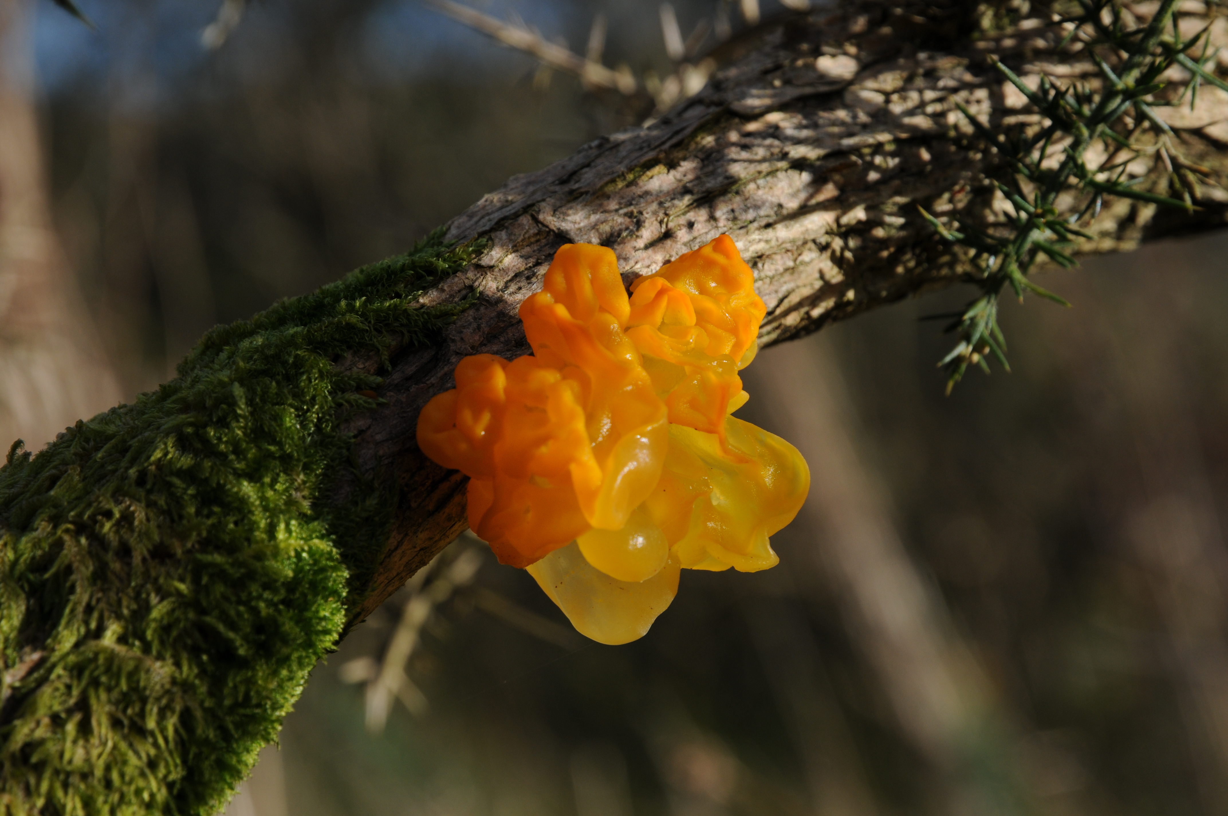 For a short distance further on the uphill side of the path was fringed with aged and twisted common gorse bushes. Attached to some of the dying stems I was delighted to find brilliant orange blobs of the gelatinous yellow brain fungus, whose flabby folds are lip-soft to touch yet strangely impervious to the weather, sometimes persisting for months.