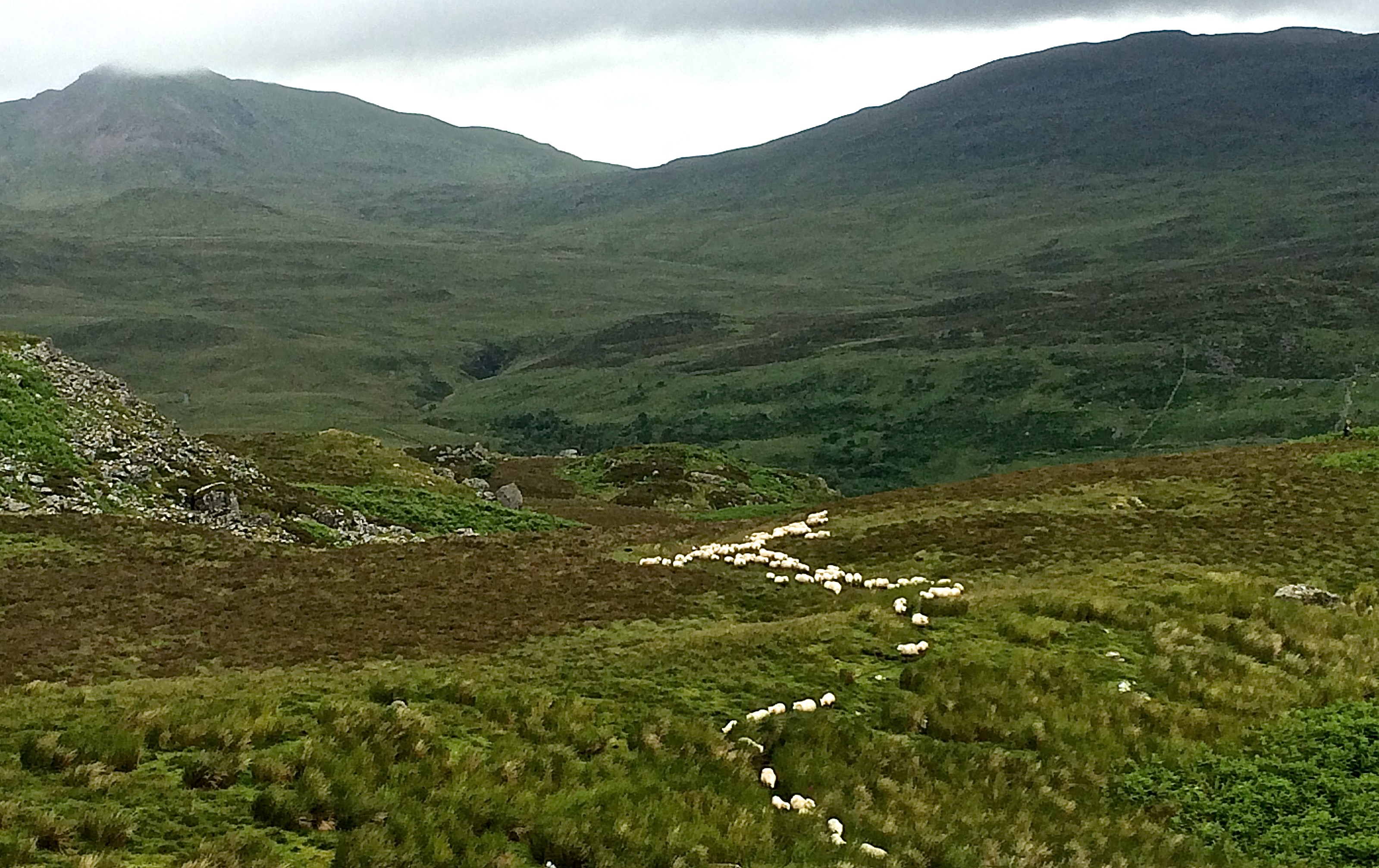 Cresting the ridge the wind spits rain into my face, making my eyes water. I am relieved I had the good sense to put on plenty of layers, which didn’t really seem necessary when I left home. The cloud is lifting, thank goodness, so I am able to scan the huge expanse of moorland and bog spread out in front of me. I can’t see any sheep, or people, which is a bit worrying. I have come up here to watch one of my neighbours ‘gather’ the sheep from his mountain-land and take them down to the farm for shearing. He should be ahead of me somewhere. Eventually I spot some sheep on the drier ground about a mile away and, encouragingly, a few are in single file heading slowly downhill.
