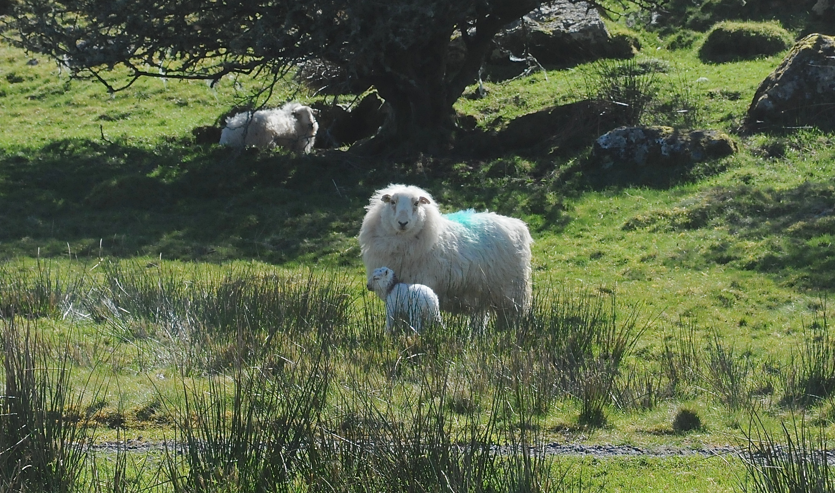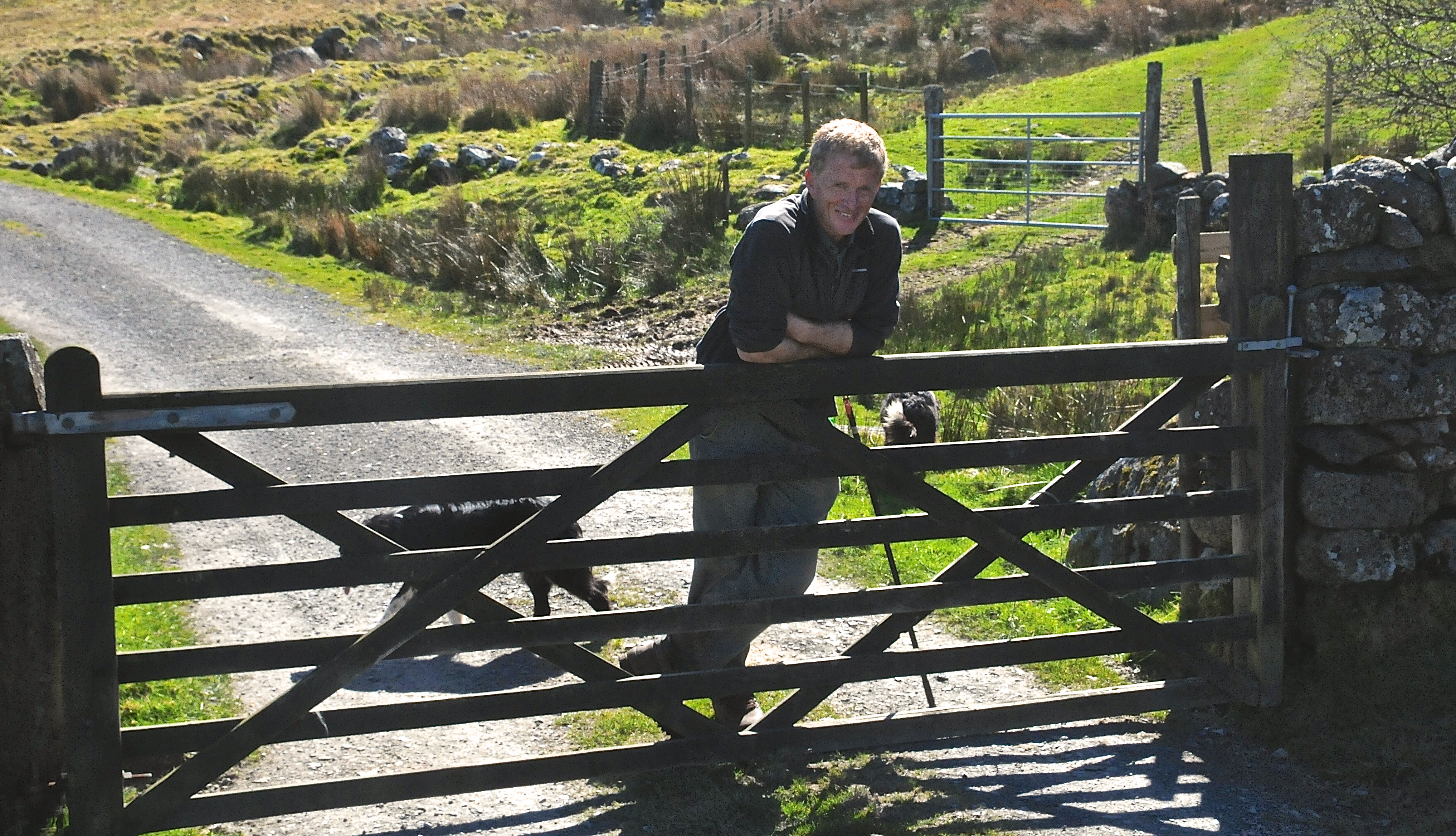I met my neighbours by the stone sheep pens; they were bringing the ewes with twins into the fields by the house to keep a close eye on them. A ewe is refusing to budge; one dog cuts off her escape route whilst the other is flat to the ground, moving forward like a crocodile. She turns to face him, stamping her foot defiantly, but gradually backs-up, her lamb close by her side. Dog and ewe are nose to nose, no more than a foot apart. Hywel is calling to the dogs – a stream of words, some soft others harsh, to which they instantly respond. Leaning on his crook, a newborn lamb under one arm, he looks totally at ease – a man in his element.