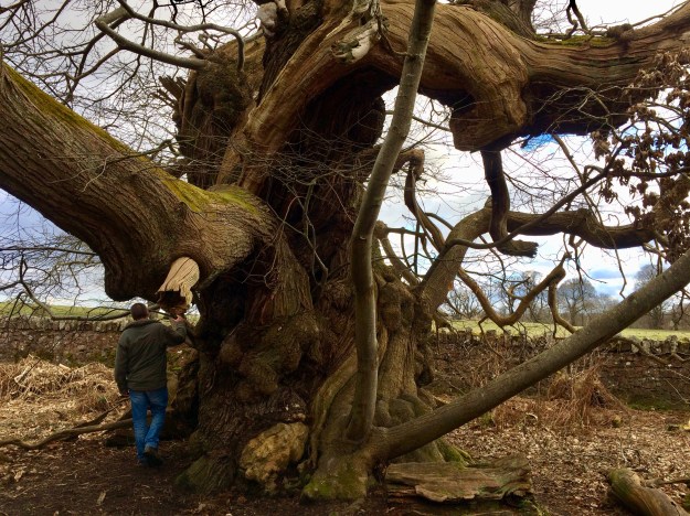 Not far away from Buttington is Chirk Castle where the National Trust boasts of 650 veteran trees in the parklands that surround the castle, so feeling enthusiastic about old trees we decided to go and pay them a visit. Some of the biggest oaks at Chirk grow along the route of Offa’s Dyke, which bisects the estate. Although not old enough to have seen King Offa build his dyke between Wales and England (AD 750) they do seem to have been planted or retained as marker trees along its route. One of the most remarkable of these at Chirk is the ‘Great Oak at the Gates of the Dead’, a split and crippled veteran with a blackened and hollow heart which stands guard at the site of the Battle of Crogen. Here in 1165 a Welsh army defeated the English (which always goes down well around here) and many of the dead are said to be buried in the adjacent field. This Methuselah, although only a teenager at the time, saw it all – and a lot more since.