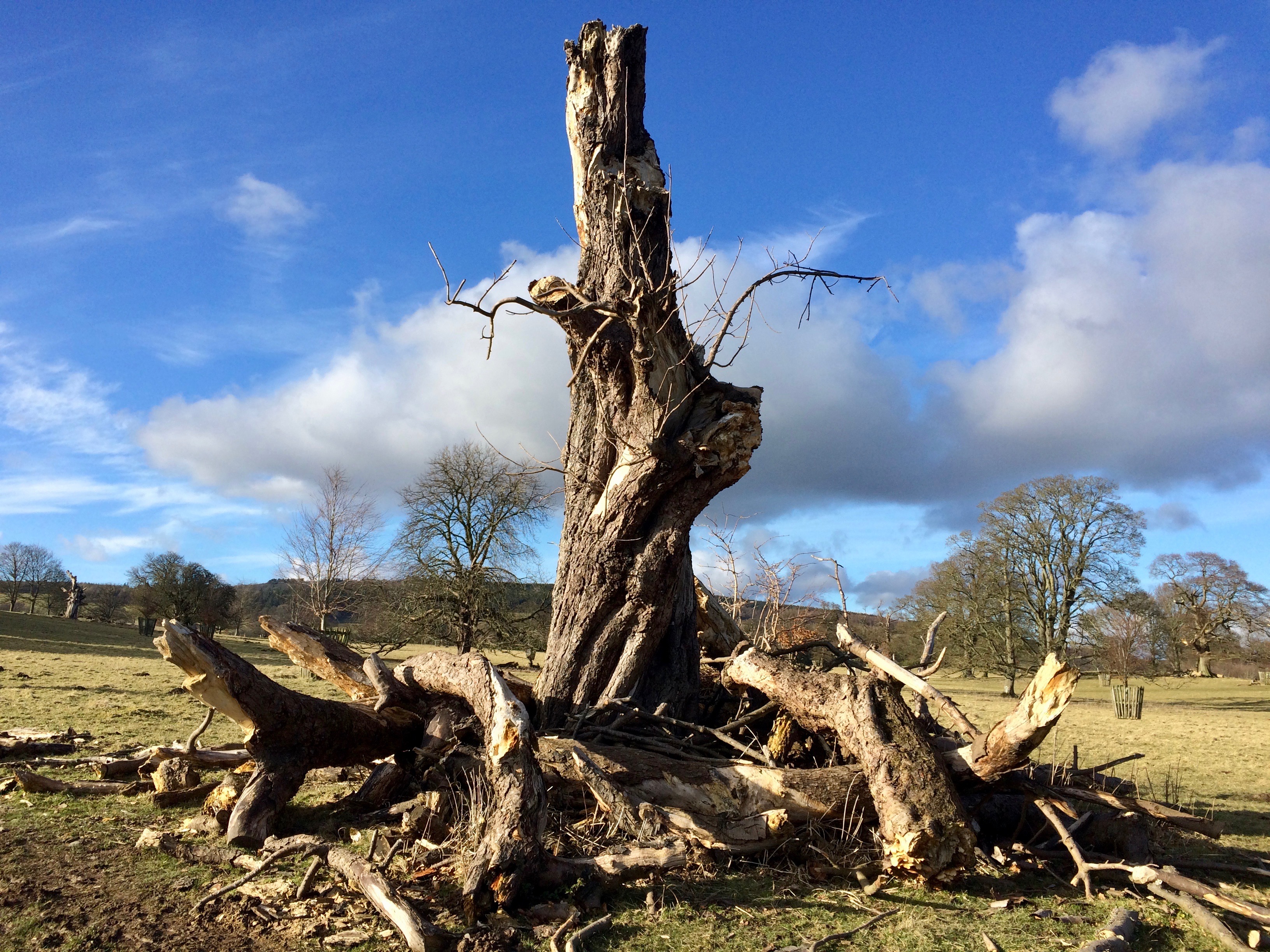 The news came through recently that one of Wales’ biggest oak trees had blown down, so we went to pay our respects. The Buttington Oak was enormous, measuring 36ft 2inches (11.03m) in girth, and was probably 8-900 years old. Plodding across the sticky alluvial clay of the Severn valley and feeling rather exposed in the unaccustomed flatness, we found the tree in a pasture just back from the riverbank. It was a colossal carcass, lying collapsed and crumpled like a shot elephant. The upturned butt was so big that the dog of a fellow pilgrim was able to walk about inside it. Despite being hollow through to the sky there was still a mass of living branches on its crown that, had it stood, would have been breaking into leaf next month. Sadly it seems that one more gale had been too much for this big-bellied ancient. I am told there has been a steady trickle of mourners to Buttington from around the country over the last couple of months; the craggy seniority and stubborn survival of very old trees seems to be an inspiration to many of us. They have a ‘presence’ that quietly puts human hubris in its place, giving rise instead to respect and even awe.