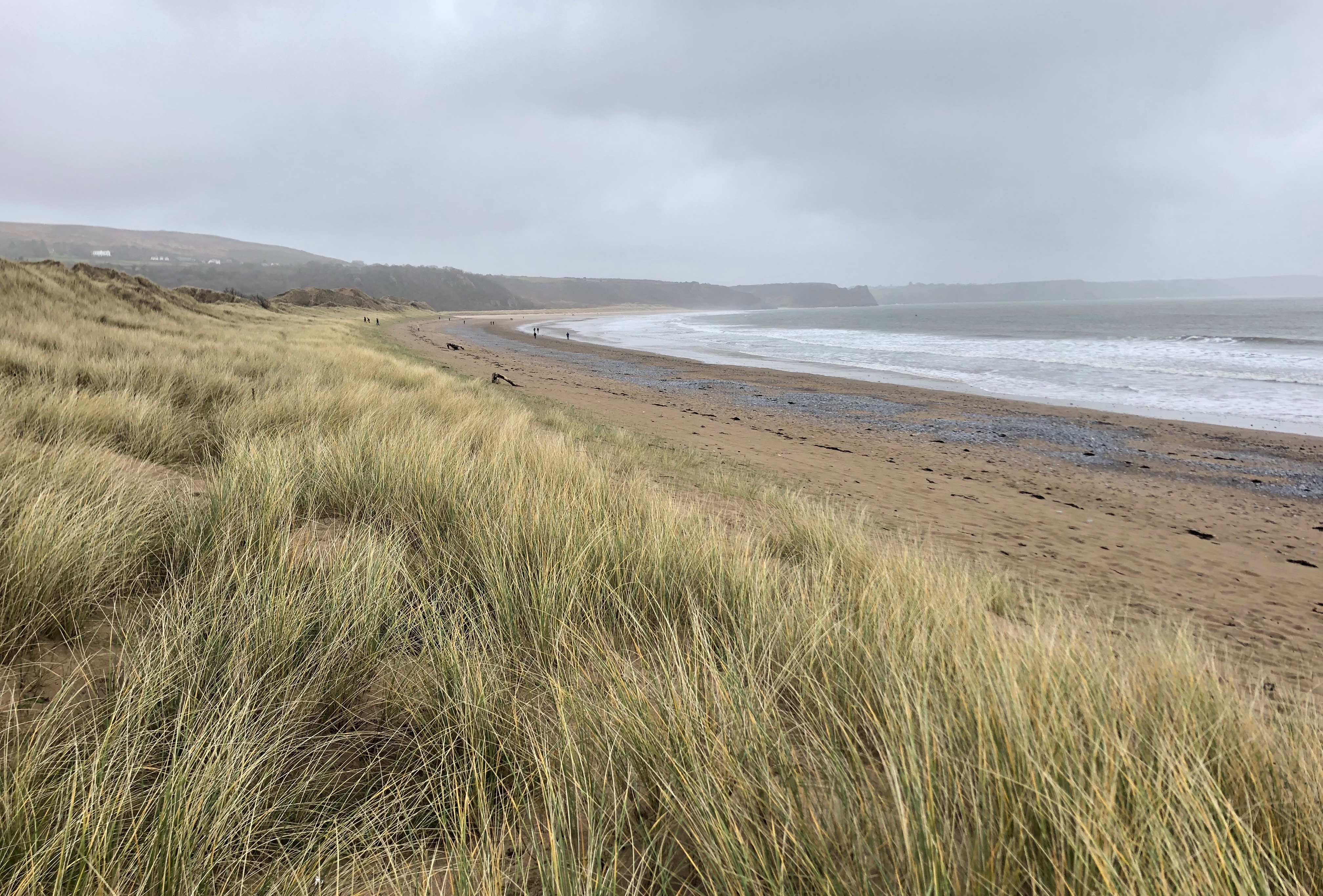On our first day we walked, in warm sunshine, down from Parkmill following the path through the woods along Pennard pill (the local name for stream). The detail was lovely: twisted wind pruned trees, gorse stems warmed by the winter sun, overhanging banks deep enough for a child to hide and hanks of bladder-wrack stranded by the tide. This steep-sided valley, watched over by a frowning castle ruin, is a perfect ‘Swallows and Amazons’ entrance to the heady space of Three Cliffs Bay. Crooked in a sheltering arm from Pennard cliffs the bay is like a child’s drawing of how the seaside should be: a stream with steppingstones, tangled woodland, rocky headlands, sand dunes and a flat sandy beach meeting the restless sea. Thousands of people are drawn to this intoxicating mixture every year but at this season it was not crowded: a few families and dog walkers, a man riding his horse along the sand with three medieval looking greyhounds at foot, and a rather solemn party of druids wearing laurel wreaths in their hair.