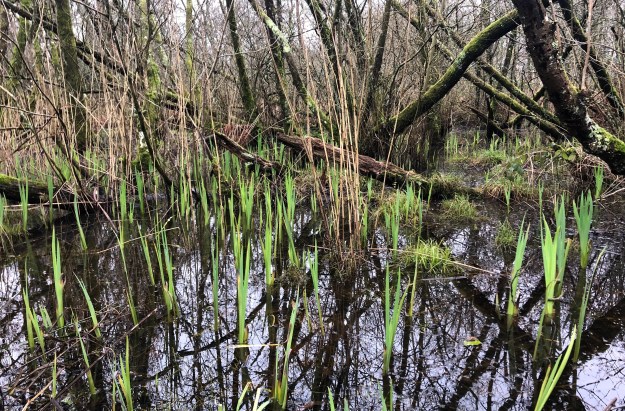 Also new to me was a series of winding boardwalks through the flooded carr woodland which gave us an inside view of a habitat previously inaccessible to visitors. A bird hide on one of the lakes was another innovation: although it gave the usual view of nothing much at all. The waterside vegetation had recently been cut back (another plus) and some wag had written on the chalkboard in the hide that they “didn’t seen much except some men in high-vis jackets working with brush cutters, and two mallard – presumably deaf ”.