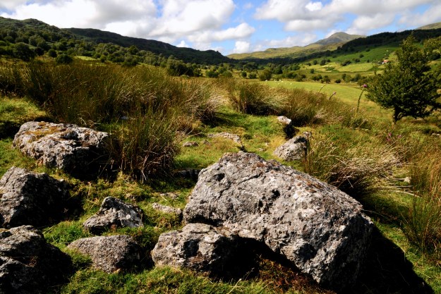 Setting off across the meadows and rough grazing, the grass is wet with dew but the streams are low after the dry weather. It is very quiet; other than a wren belting it out and the intimate calls of house martins swooping around me there is a deep silence. It is already getting hot; a gentle breeze barely stirs the leaves. As I walk my boots scuff against heath bedstraw, bright yellow hawkweeds and the green bladders of seeding bluebells. Facing up the valley towards Moel Llyfnant there is little evidence of ‘human time’, just the unhurried rhythm of natural processes. The rocks, squat hawthorns and sheep cradled in this valley feel like a scene outside of time – as if nothing has ever changed and never will.