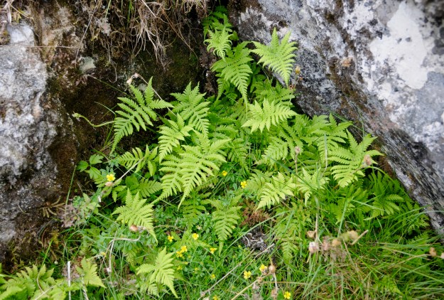 Heading uphill I scramble over the fence into the woodland (a bit of a challenge for my new hip) and everything changes; or at least intensifies. Because it is so rare that anybody comes into these woods they have an untouched, fairy-tale atmosphere. A buzzard circling overhead starts mewing, a wild sad sound that only adds to the estrangement. Under the gnarly trees the grasses and ferns are tall: patches of stately marsh hawk’s-beard and valerian decorate the wetter places, delicate beech ferns fringe a chaos of rocks. I feel uncomfortable about crushing the vegetation, as if by walking here I am spoiling the place. Painstakingly I clamber up the moss covered block scree, testing each step with my stick; this is not quite what the doctor ordered.
