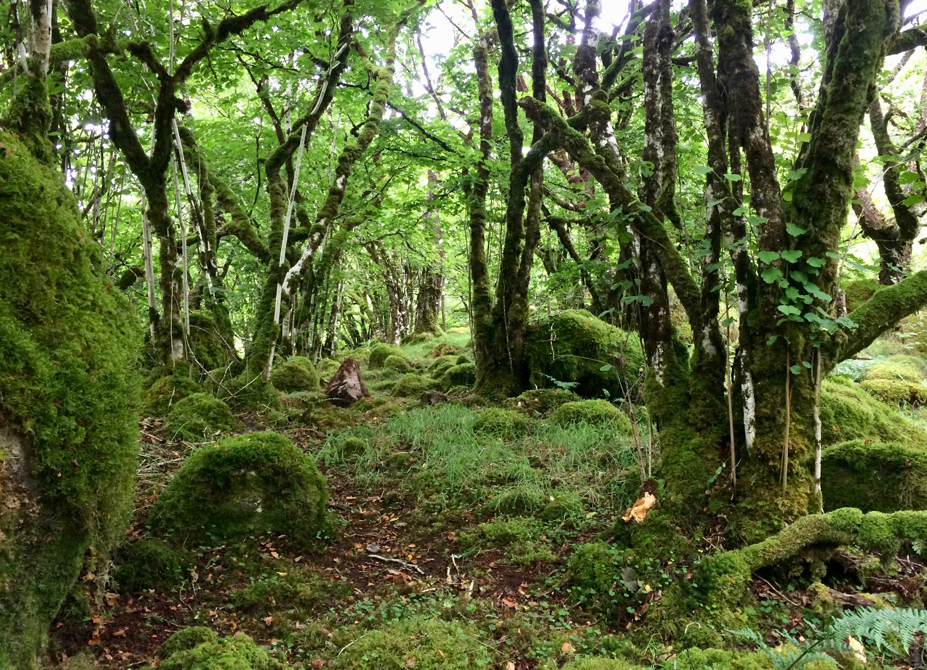 I make it up to the base of the cliff and settle down with my back against a rock. Looking down I can see through the twisted intricacy of woodland to the rough pastures both sides of the river half a mile away. From there the lower slopes of the mountain is gridded with elderly stone walls and above them a long bare ridge ascends to the summit of the Arenig at nearly 3000 feet. There probably isn’t a single other human being between here and there. Around me the plant and insect life is prolific: small flies, a beetle and various spiders run over my clothing and notebook as I write. Two spotted flycatchers ‘tsskk’ their soft familiar call at me; I am surprised to find them here so far from habitation. Perhaps they have a nest in a rock crevice, the sort of place they must have used before houses and barns existed. The air smells clean and sappy – fresh and far from harm.