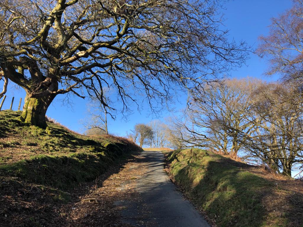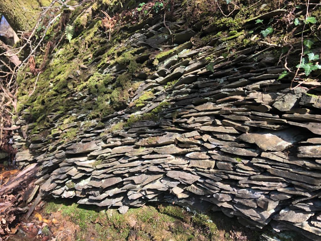 At this point the trickle beside the road runs into a kind of slate cistern, the sort of thing a posh garden centre would rob you blind for – but here, made long before artisans drank lattes, it is half overgrown and entirely forgotten. A bit further up, where the road crosses a stream, a dry-stone wall made from thousands of slate shards is twisted out of shape by tree roots, but it still supports the bank. It is hard to imagine the patience and fortitude needed to make such a thing for seemingly such a slight purpose. It reminds me of Andy Goldsworthy’s work, which shines a light on the everyday artistry that was once everywhere and nowhere in the countryside.