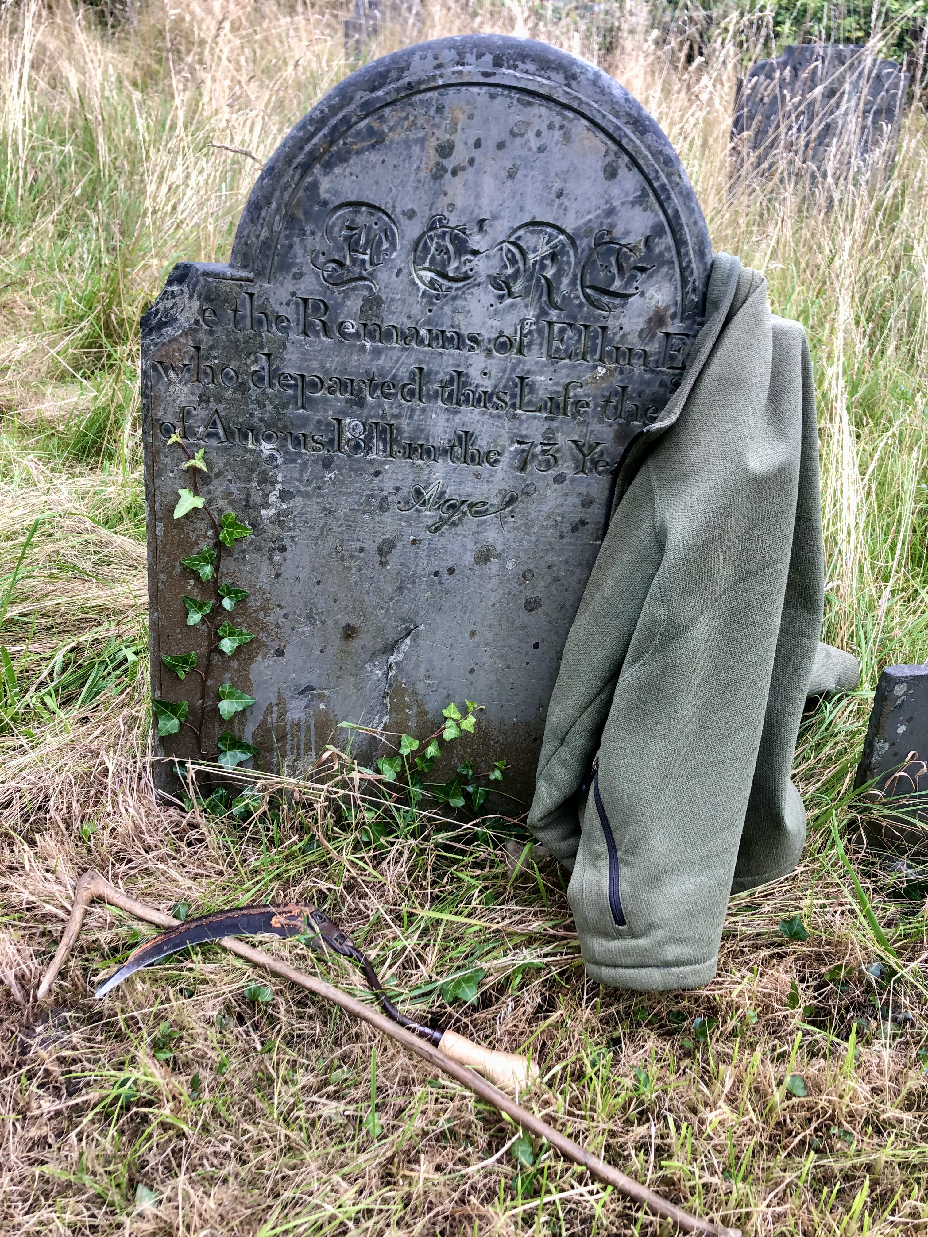 It is deeply peaceful around the back of the church, away from the traffic and with a fine view of the hills. A good place to be interred. There is something about the work we were doing which seems timeless. Scythe, sickle, rake and a rattling wheelbarrow. Now and again we stop to talk, leaning on our tools in a way people would have done for centuries before mechanisation. I don’t suppose this is the first time this churchyard has been scythed – but the ‘tshic, tshic’ of the whetstone on steel won’t have been heard here for a long time. Taking a break, we draped our coats over a gravestone and sat on a tomb, without a hint of disrespect.